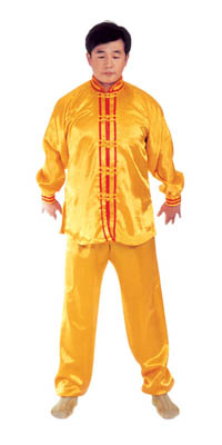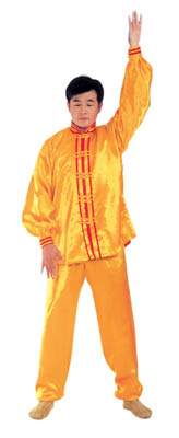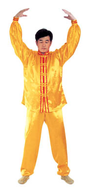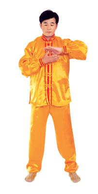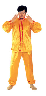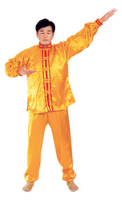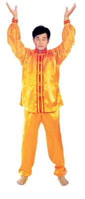 Chưởng chỉ càn khôn—Từ khởi thế “hợp thập”. Hai tay rời ra (hình 1-6), cách nhau khoảng 2–3 cm, đồng thời bắt đầu xoay bàn tay, bàn tay trái đối với nam (tay phải đối với nữ) xoay về hướng ngực, bàn tay phải xoay theo chiều ra ngoài ngực, tạo thành bàn tay trái ở trên bàn tay phải ở dưới; [bàn tay] và cẳng tay tạo thành hình chữ ‘nhất’2. Tiếp theo, cẳng tay trái hướng sang trái lên trên mà duỗi ra (hình 1-7), lòng bàn tay hướng xuống dưới, cao độ của tay và đầu là bằng nhau. Tay phải vẫn để trước ngực, lòng bàn tay hướng lên trên. Khi tay trái đã vào vị trí, thì đầu dựng thẳng lên, hai bàn chân dẫm xuống, toàn thân dùng lực căng ra. Căng khoảng 2–3 giây, rồi toàn thân lập tức chùng lại, tay trái trở về trước ngực cùng với tay phải thành ‘hợp thập’ (hình 1-5). Sau đó lại chuyển bàn tay, bàn tay phải ở trên, bàn tay trái ở dưới (hình 1-8) mà triển khai. Tay phải làm động tác giống tay trái khi trước (hình 1-9), căng rồi chùng; sau khi thu hồi tay, lại ‘hợp thập’ ở trước ngực.