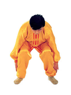 Vừa tách khỏi trạng thái “hợp thập” hai tay vừa hạ xuống vị trí bụng dưới trong khi lòng bàn tay hướng vào thân thể, khoảng cách giữa bàn tay và thân thể không vượt quá 10 cm. Tay vượt quá bụng dưới rồi duỗi tiếp xuống phía giữa hai chân, xuôi theo mé trong đưa xuống, đồng thời khom lưng ngồi xổm xuống (hình 4-3). Khi hai tay gần đến mặt đất, liền [đưa tay] vạch từ đầu ngón chân tới mé ngoài chân qua phía sau gót chân (hình 4-4). Sau đó, hai cổ tay hơi cong lại, từ sau gót chân dần dần dâng lên thuận theo phía sau cẳng chân (hình 4-5). Vừa đưa hai tay lên ở phía sau lưng, vừa dựng thẳng eo lưng lên (hình 4-6).