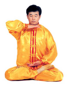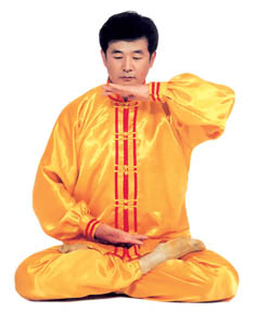 Tĩnh công tu luyện—Thực hiện tiếp bên trên. Tay trên vạch một nửa hình tròn phía trước hạ xuống chỗ bụng dưới, hai tay tạo thành trạng thái kết ấn (hình 5-15), tiến nhập vào ‘tĩnh công tu luyện’. Nhập định thâm sâu, tuy nhiên chủ ý thức cần phải biết rằng mình đang luyện công. Yêu cầu thời gian càng lâu càng tốt; tuy nhiên có thể làm được bao lâu thì làm bấy nhiêu lâu.