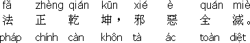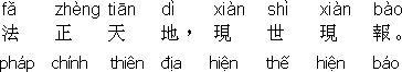 26. Dịch theo nghĩa của chữ: Thủ ấn → thế tay; đơn thủ lập chưởng → một bàn tay dựng lên; liên hoa → hoa sen; Pháp Chính càn khôn → Pháp chỉnh lại càn khôn vũ trụ; tà ác toàn diệt → tà ác bị diệt hoàn toàn; Pháp Chính thiên địa → Pháp chỉnh lại thiên địa trời đất; hiện thế hiện báo → báo ứng trong đời này.